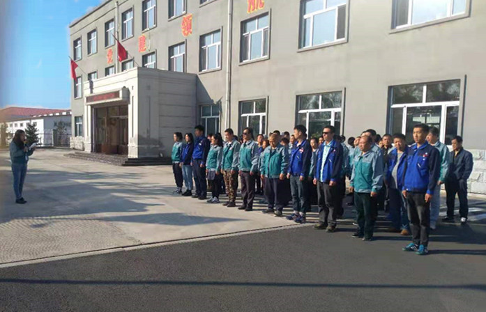 第二項,升國旗。升旗手黨員閆海峰,鮮紅的國旗,迎著朝陽,冉冉升起。伴隨著刻骨銘心的旋律,每名員工向國旗行注目禮。
